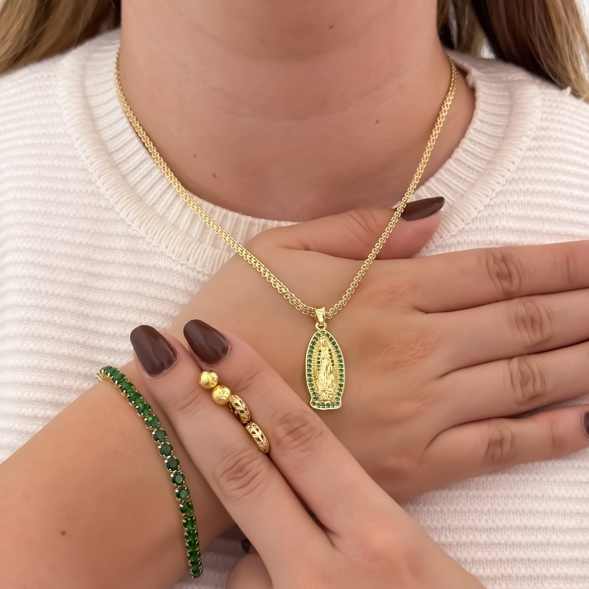 Cadena Tejido Chino de Dama de 45cm de 3mm + Virgen de Guadalupe Micro Circones Verde Esmeralda + Pulseras Tennis Verde Esmeralda + Candongas Lisa + Topo Diamantado de 6mm en Oro Laminado 18k con Garantia de por vida
